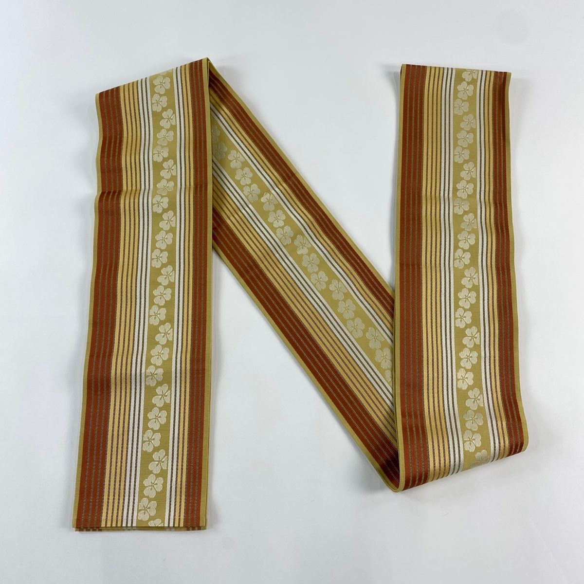 半幅帯 秀品 博多織 証紙 縞 花 黄土色 正絹 GLOBALQUALITYIMPORTS_COM