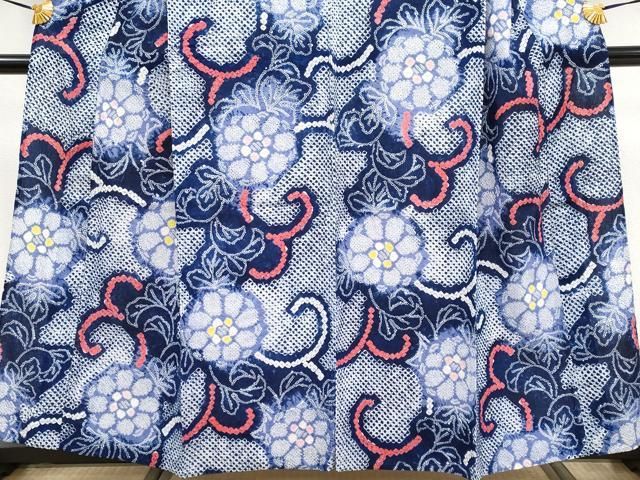 浴衣 身丈153cm 裄丈63cm S 絞り浴衣 花 亀甲 濃紺 綿
