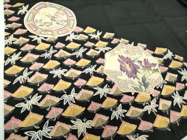 黒留袖 扇子に花模様 飛翔鶴 青海波 組紐 金駒刺繍 K-5332