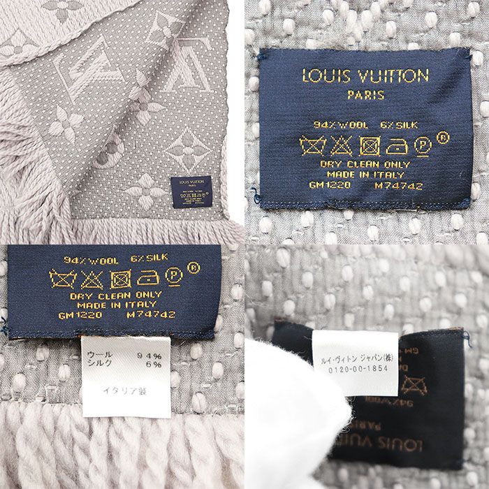 LOUIS VUITTON ルイ ヴィトン マフラー エシャルプ ロゴマニア モノグラム LV 総柄 ウール × シルク ダブルフェイス フリンジ メンズ レディース ユニセックス グリペルル パールグレイ イタリア製 M74742 GLOBALQUALITYIMPORTS_COM