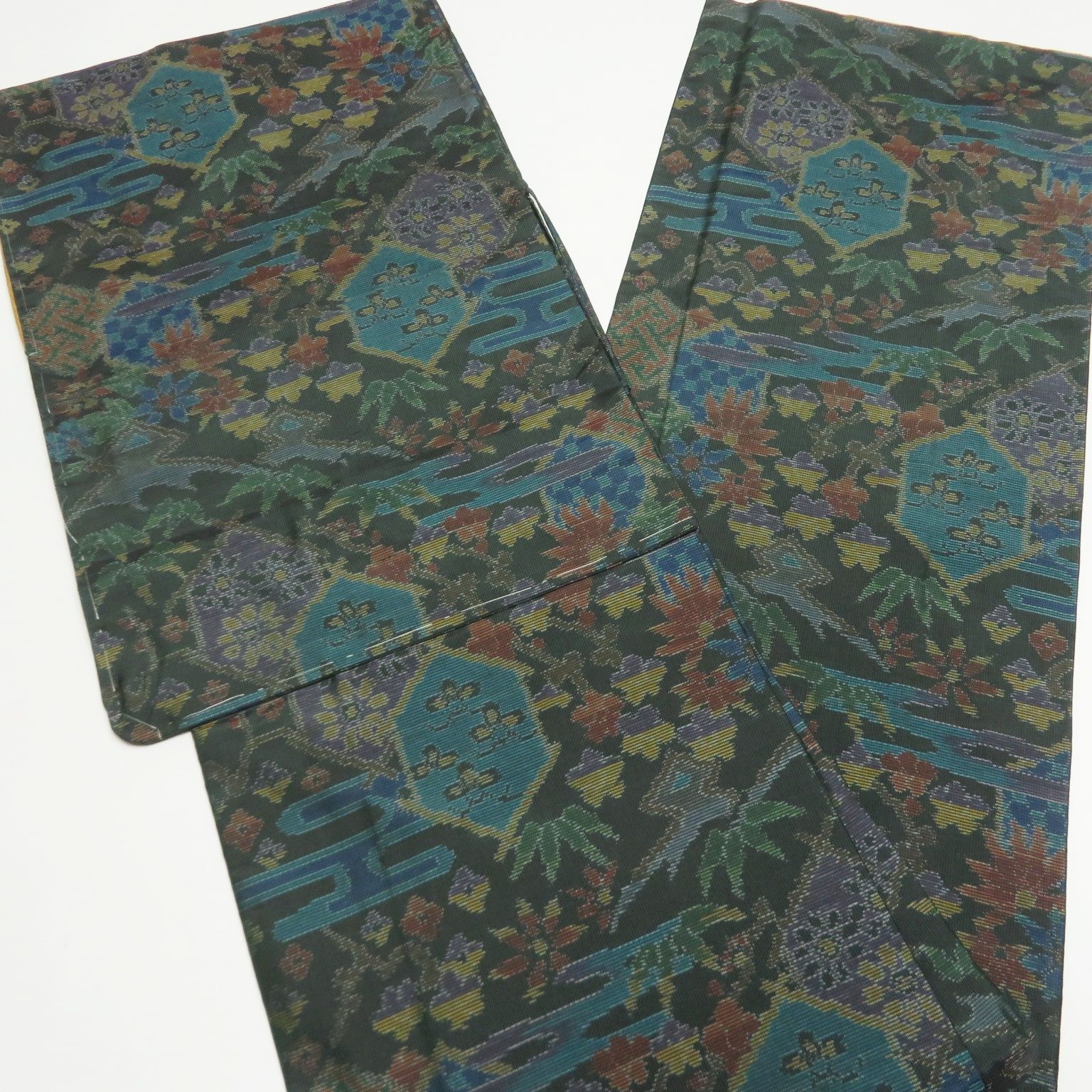 平和屋着物 アンティーク 大正ロマン 九寸名古屋帯 駒刺繍 総刺繍 鏡裏花文 黒地 金糸 正絹 DAAX3376az