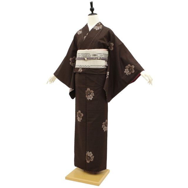 新古品 本場奄美大島紬 本場大島紬 着物 正絹 愛加那絣 牧絹織物 芭蕉染 手織り こげ茶地 桜 さくら 花柄 花 カジュアル 春 秋 冬 仕立て上がり 大島紬 復元 紬 真綿紬 身丈160 裄丈66.5 Mサイズ みやがわ sb16403 GLOBALQUALITYIMPORTS_COM