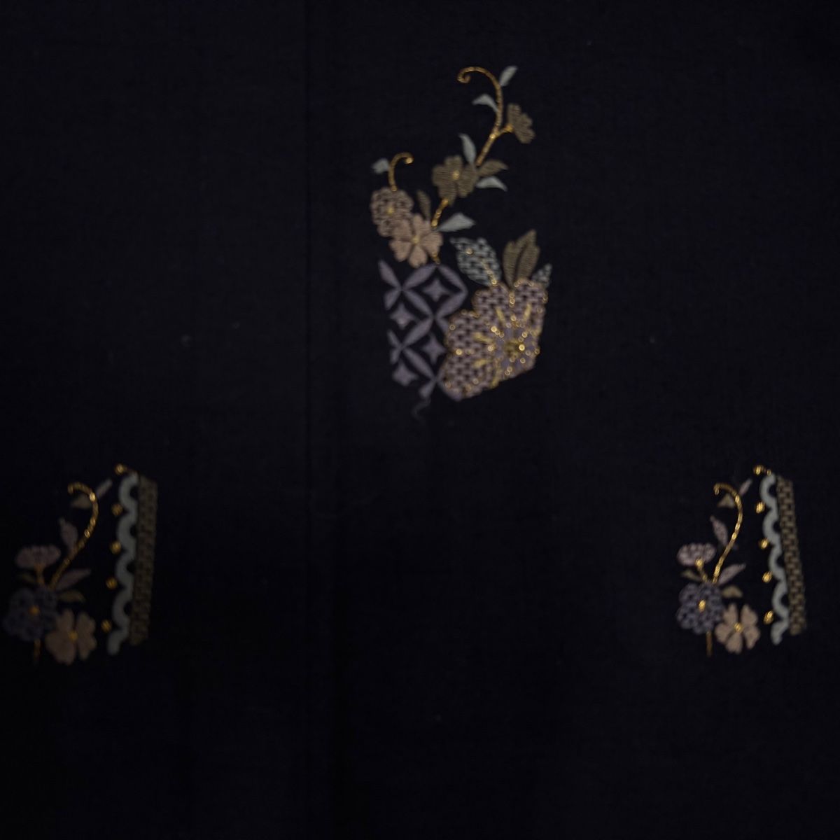 付下げ 身丈166.5cm 裄丈65cm M 単衣 紬地 草花 七宝 金糸 刺繍 濃紺 正絹 秀品の検索結果