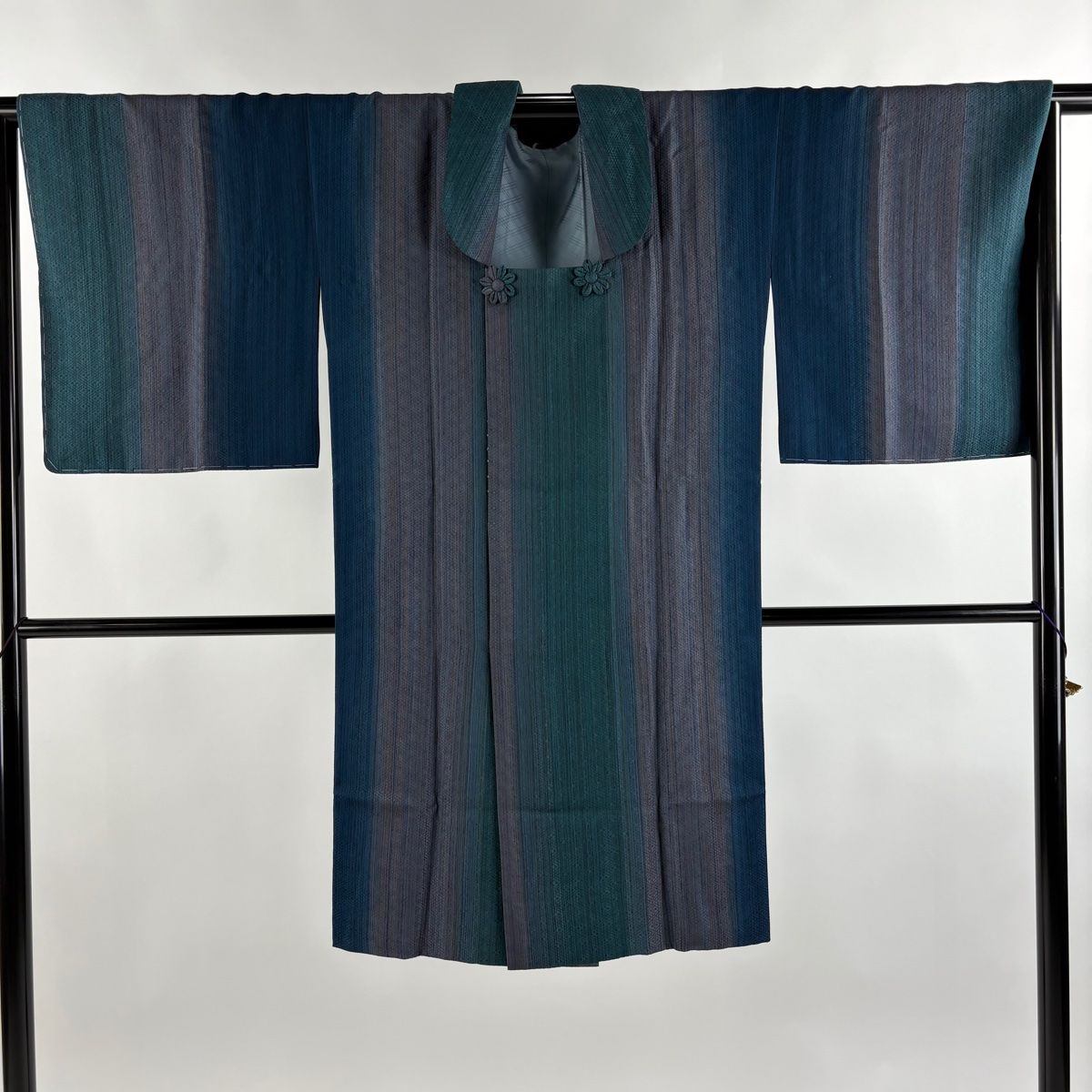 道行 身丈106cm 裄丈68cm L 坂東三津五郎 和装コート 被布衿 やまと 落款 縦縞 地紋 青緑 正絹の検索結果