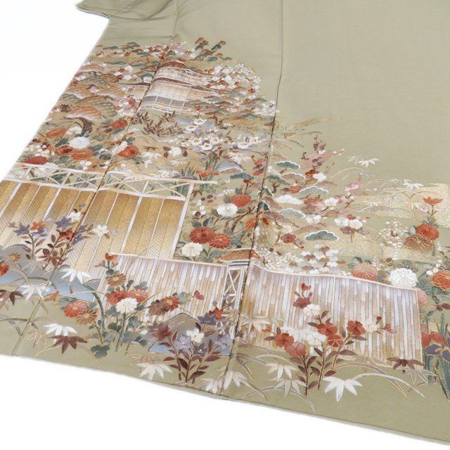 色留袖 着物 正絹 袷 紋付 一つ紋 蘇州刺繍 中国刺繍 花の図 箔糸 抹茶色 多色 身丈153.5cm 裄64.5cm SA きもの北條 A1286-10 GLOBALQUALITYIMPORTS_COM