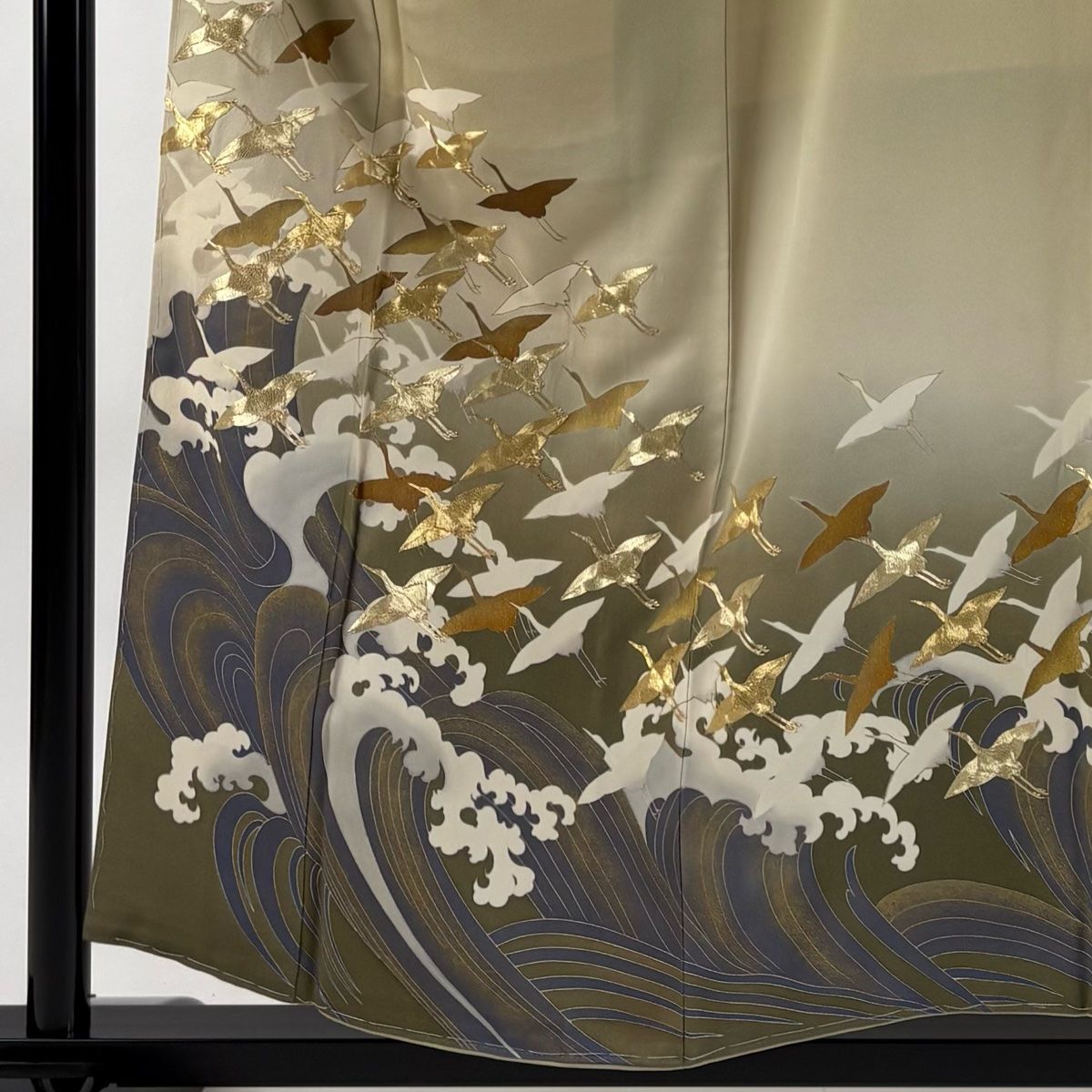 色留袖 身丈155cm 裄丈62cm S 袷 落款 鶴 波頭 金糸 金彩 薄黄土色 正絹 秀品 一つ紋の検索結果