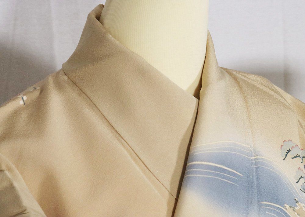 本加賀友禅 吉川久仁氏作 手描き友禅 訪問着 袷 正絹 茶ベージュ 青グレー 茶屋辻 松竹梅 流水 SMサイズ ki28963 ほうもんぎ み GLOBALQUALITYIMPORTS_COM