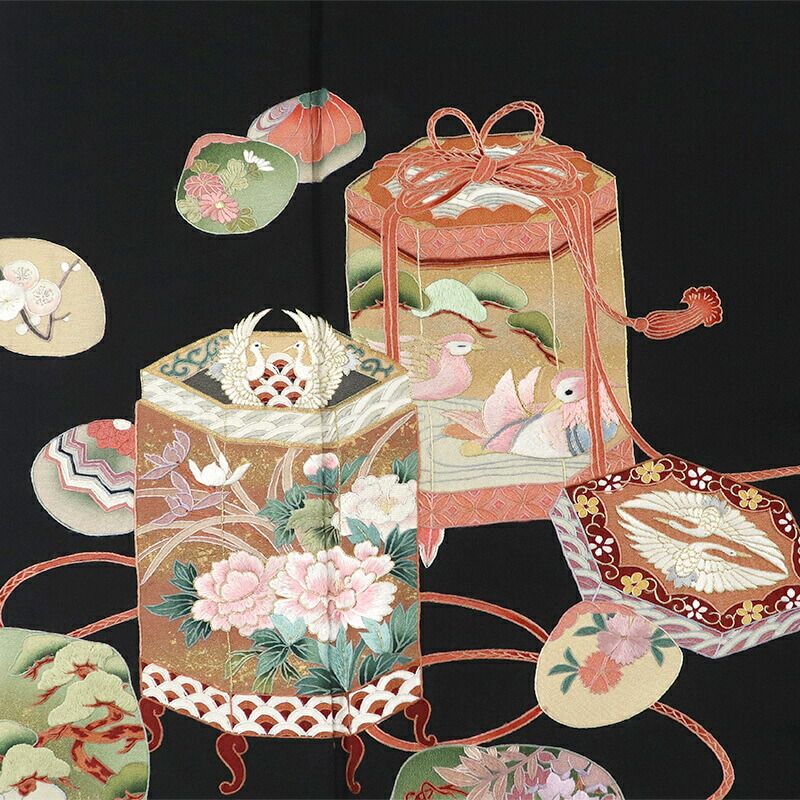 平和屋着物 上 アンティーク 大正ロマン 黒留袖 駒刺繍 檜扇飛鶴花文 金彩 CZAA3317s5