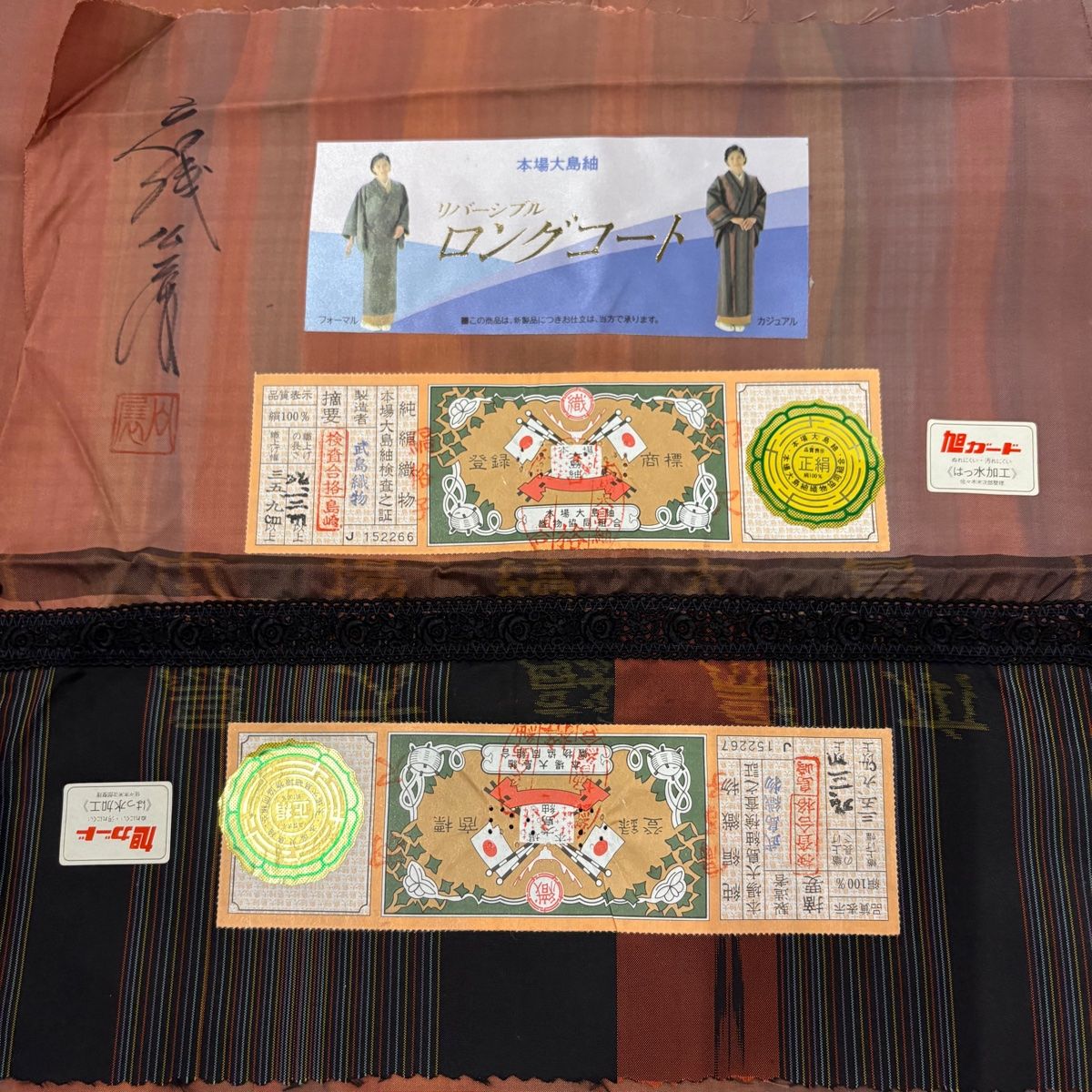 道中着 身丈131.5cm 裄丈67cm M 和装コート 着物衿 リバースブル 大島紬地 落款 証紙 縞 赤茶 正絹 GLOBALQUALITYIMPORTS_COM