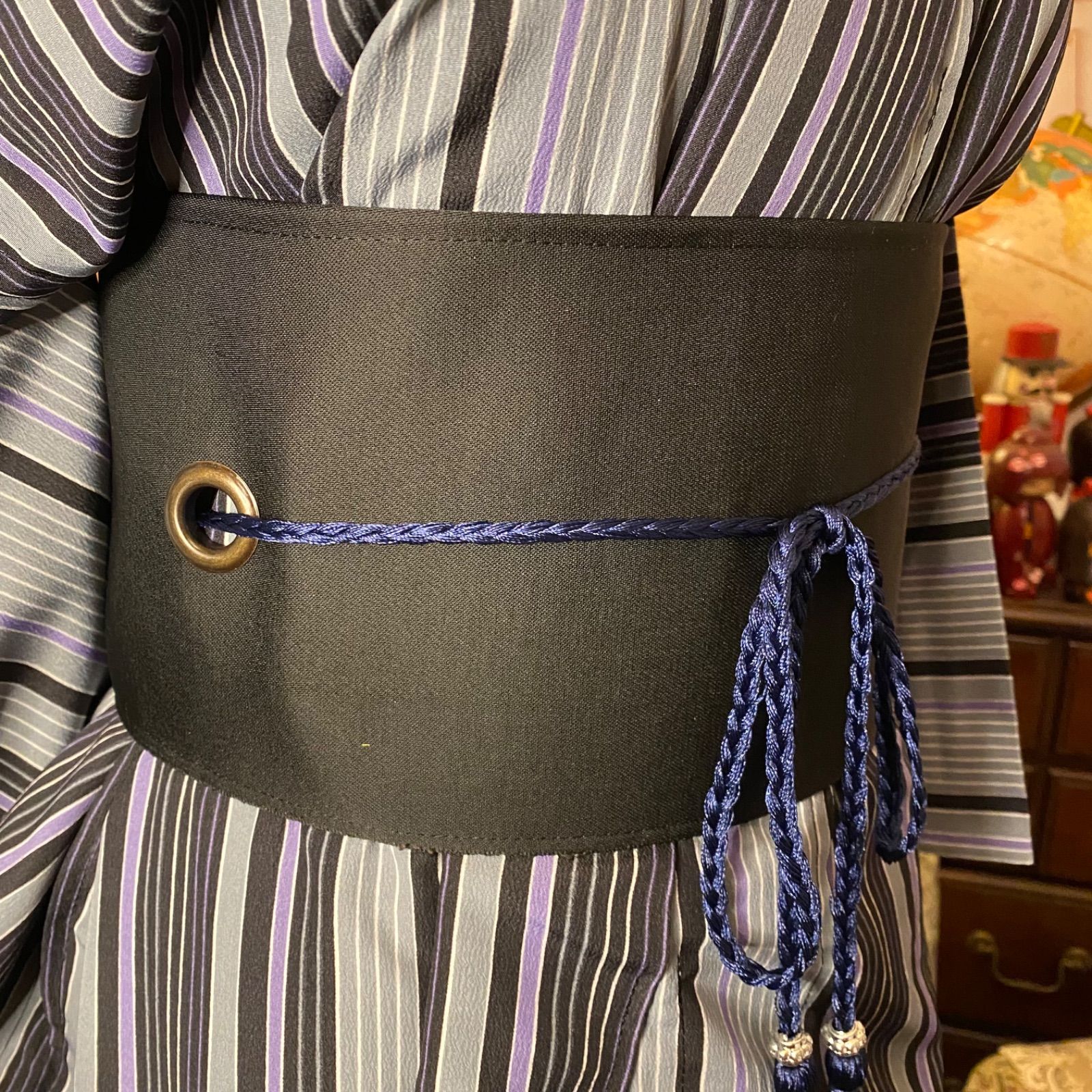 着物 2way ガウン 羽織り ドレス ワンピース ハンドメイド 和洋折衷 洗える 化繊 リメイク 帯サッシュベルト レトロ 古着 墨黒~銀鼠のモノトーンに 太細ピッチを交差させた正統派ストライプ KD-58 GLOBALQUALITYIMPORTS_COM