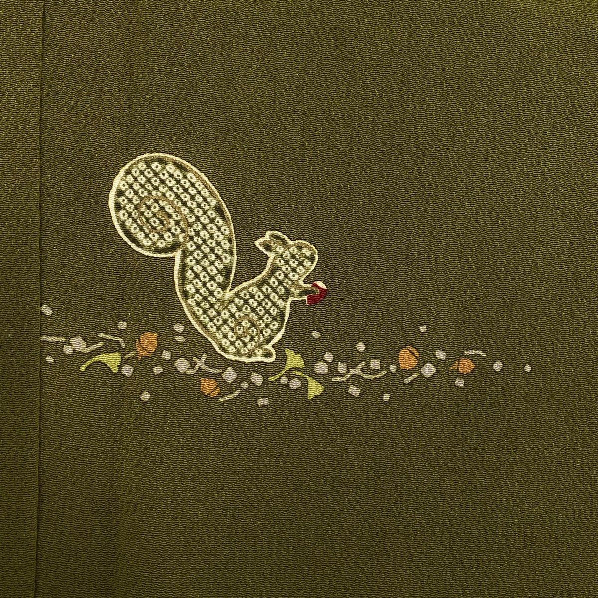 小紋 身丈168.5cm 裄丈68cm L 袷 リス どんぐり 縮緬 茶緑色 正絹の検索結果