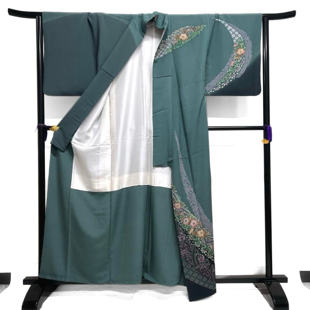 訪問着 身丈159cm 裄丈64cm M 袷 落款 牡丹 草花 金銀彩 金通し 灰緑 正絹 秀品