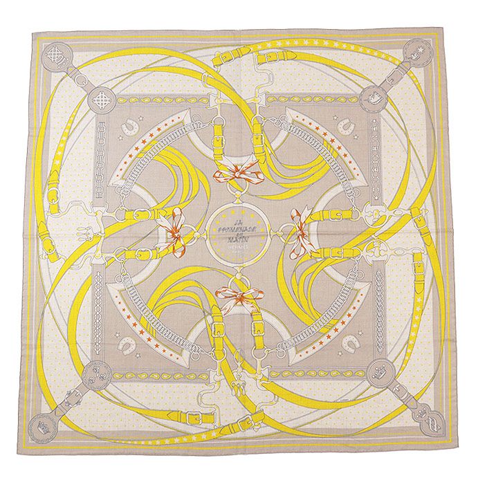 HERMES エルメス カレジェアン140 スカーフ LA PROMENADE DU MATIN 朝の散歩 馬具モチーフ カシミヤ × シルク メンズ レディース ユニセックス ベージュ イエロー フランス製 アンリ ドリニー GLOBALQUALITYIMPORTS_COM