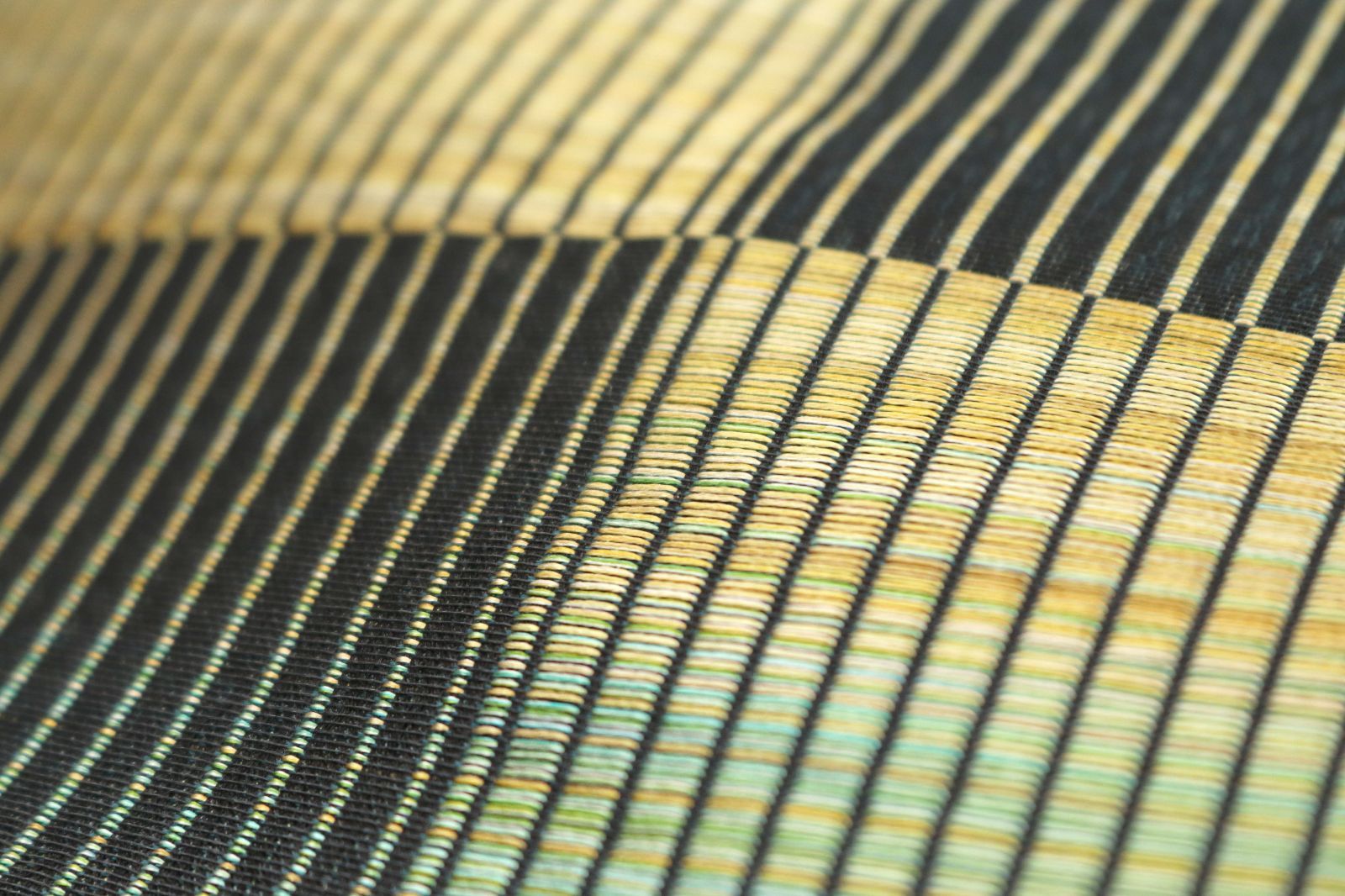 全体には、市松状に模様が配されております。黒色、ベージュ色、薄緑色などのお色目で、グラデーションの縞が織り出されております。柄は近くで見ますと、畳っぽい雰囲気にも見えます。