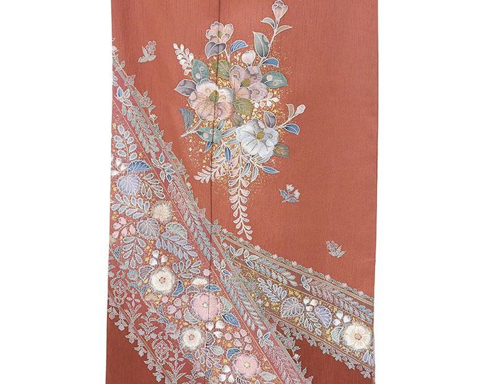 訪問着 身丈163cm 裄丈65.5cm M 袷 椿 梅 刺繍 金彩 灰白 正絹 秀品