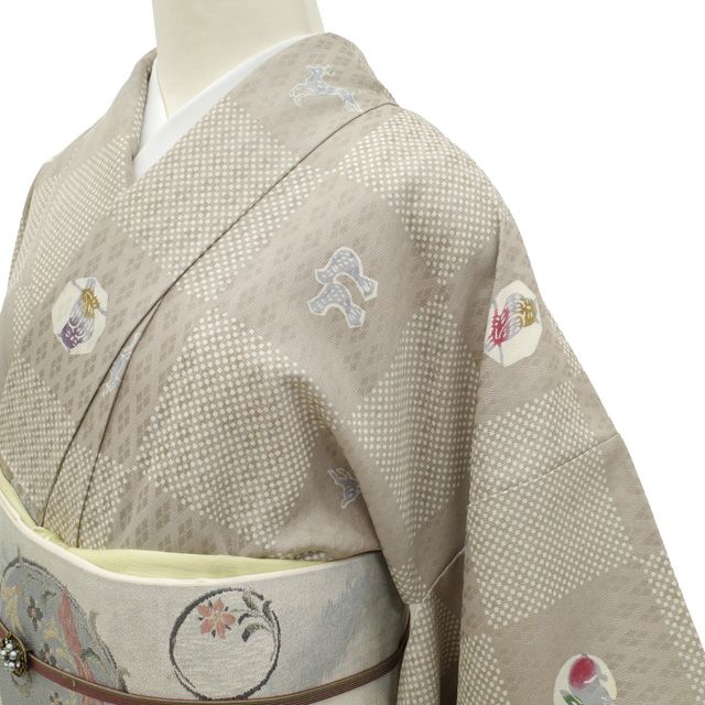 小紋 着物 リサイクル 正絹 草苑 型絵紅型染 松煙染 黒染衣 古代織 1社1技術 手染め グレージュ オフホワイト 市松 動物柄 うさぎ ミミズク 鹿 ハト 鳥 春 秋 冬 仕立て上がり 身丈164 裄丈66.5 Lサイズ みやがわ sb16541 GLOBALQUALITYIMPORTS_COM