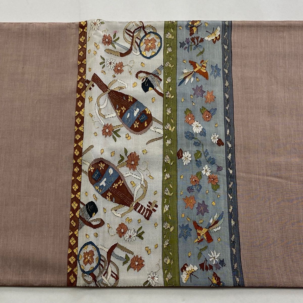袋帯 和楽器 花鳥 金銀糸 薄小豆 お太鼓柄 正絹 GLOBALQUALITYIMPORTS_COM
