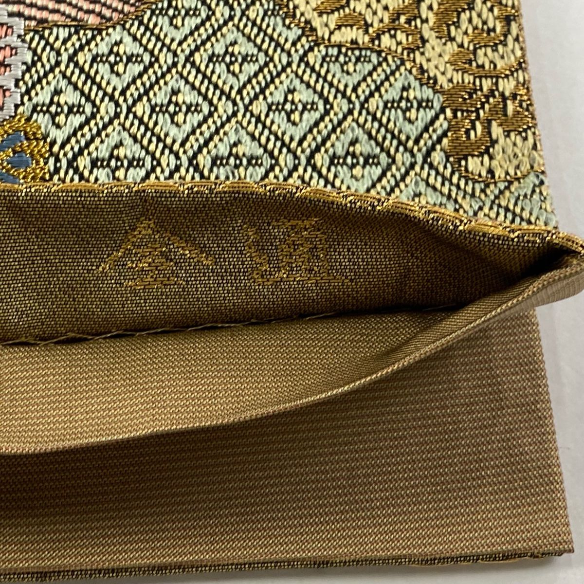 袋帯 落款 篠屋宗兵衛 市松 花鳥 唐織 箔 クリーム 全通 正絹