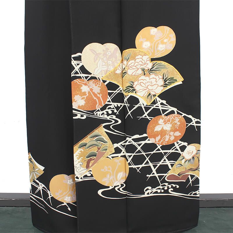 黒留袖 販売 単品 礼装 着物 和装 フォーマル 正絹 黒 丸に横木瓜 冊子文 団扇文 落款 身丈166cm 裄丈66cm 結婚式 母親 M Lサイズ相当 リサイクル着物 リユース着物 着物 GLOBALQUALITYIMPORTS_COM