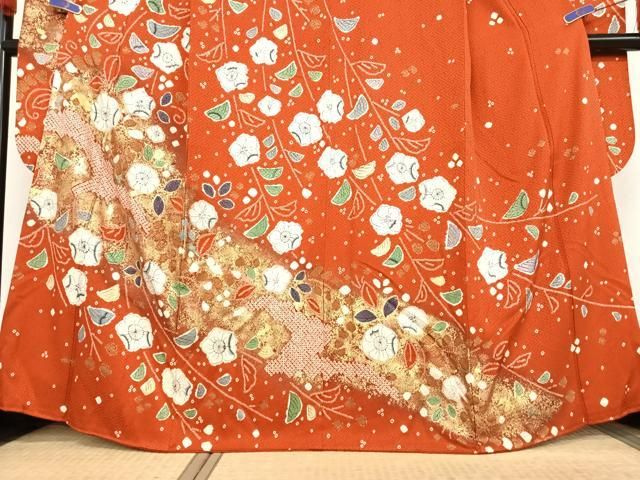 振袖 身丈169cm 裄丈68cm L 袷 辻が花柄 銀通し 絞り 朱色 正絹