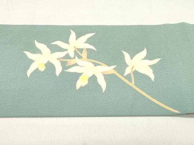 平和屋着物 九寸名古屋帯 友禅 作家者 草花文 水浅葱色 鬼しぼ縮緬 正絹 DAAY0191ob GLOBALQUALITYIMPORTS_COM