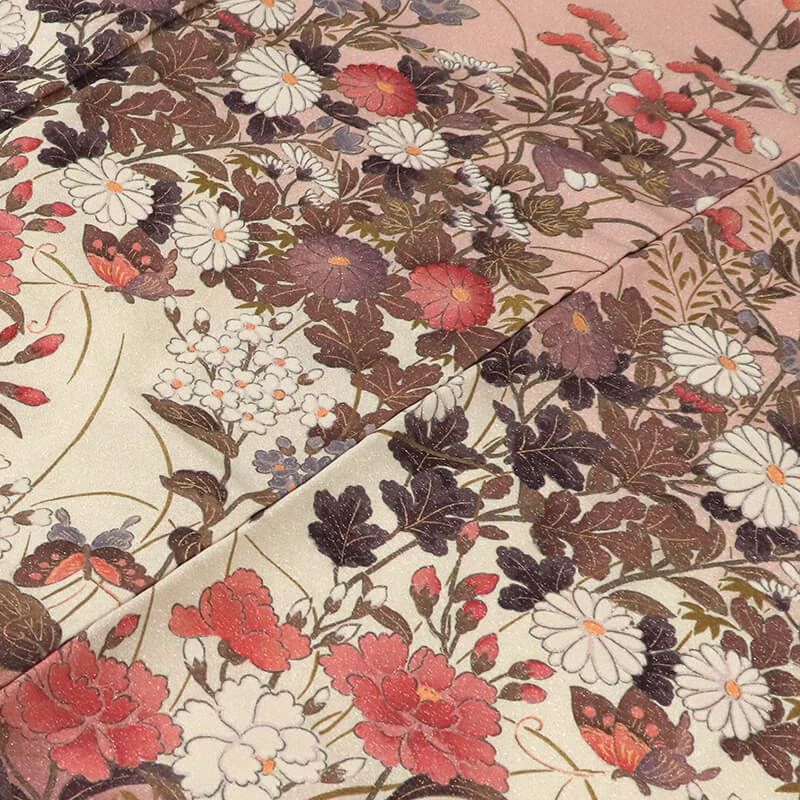 付下げ 袷 レディース 正絹 桃色 灰 花柄 百合 菊 蝶々 身丈156cm 裄丈65cm 式典 結婚式 パーティ Mサイズ相当 GLOBALQUALITYIMPORTS_COM