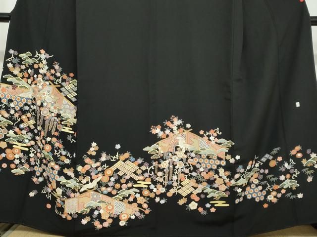 黒留袖 扇子に花模様 飛翔鶴 青海波 組紐 金駒刺繍 K-5332