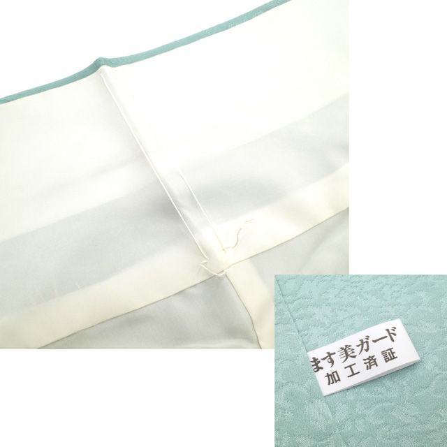 色無地 着物 リサイクル 正絹 ますいわ屋 扱い 青磁色地 ミント 青緑 地紋 寄せ柄 蜀江 華文 草花 花鳥 牡丹唐草 一つ紋 桔梗 セミフォーマル 春 秋 冬 仕立て上がり 身丈165 裄丈69 Lサイズ みやがわ sb16466 GLOBALQUALITYIMPORTS_COM