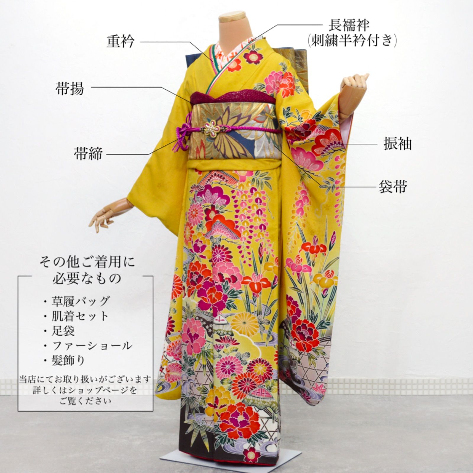 正絹 振袖フルセット S〜Mサイズ 紅型 成人式 山吹色 パールトーン加工済み 長襦袢付き お仕立て済み イエロー パープル グリーン 個性的 伝統 古典 着物 豪華 結納 卒業式 振袖セット F228 GLOBALQUALITYIMPORTS_COM