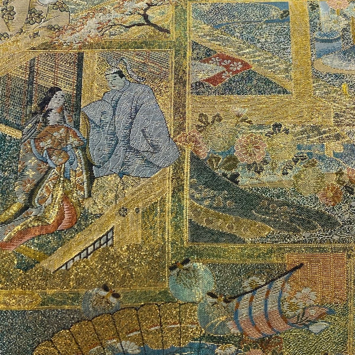 丸帯 落款 徳川美術館秘蔵 紫式部 源氏物語名鑑 人物 扇 箔 青緑 全通 正絹 GLOBALQUALITYIMPORTS_COM