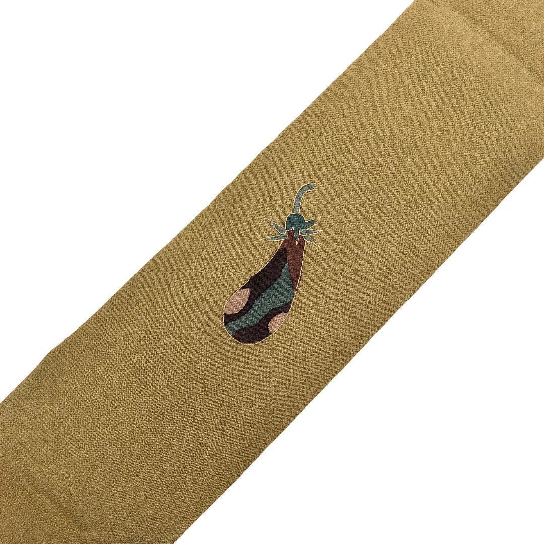 名古屋帯 野菜柄 茄子 豆 縮緬 国防色 長尺 O-5543 GLOBALQUALITYIMPORTS_COM