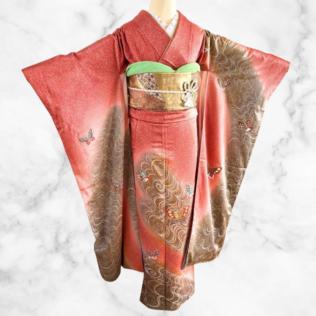 トールサイズ 振袖フルセット 正絹 刺繍衿付き 身丈170cm 裄68cm 赤 オレンジ 茶 グラデーション 蝶 金彩 豪華 上品 成人式 結婚式 晴れの日 一式 コーディネート済 晴れ着 高身長向け フォーマル 着物セット 前撮り 撮影用 振袖一式 GLOBALQUALITYIMPORTS_COM