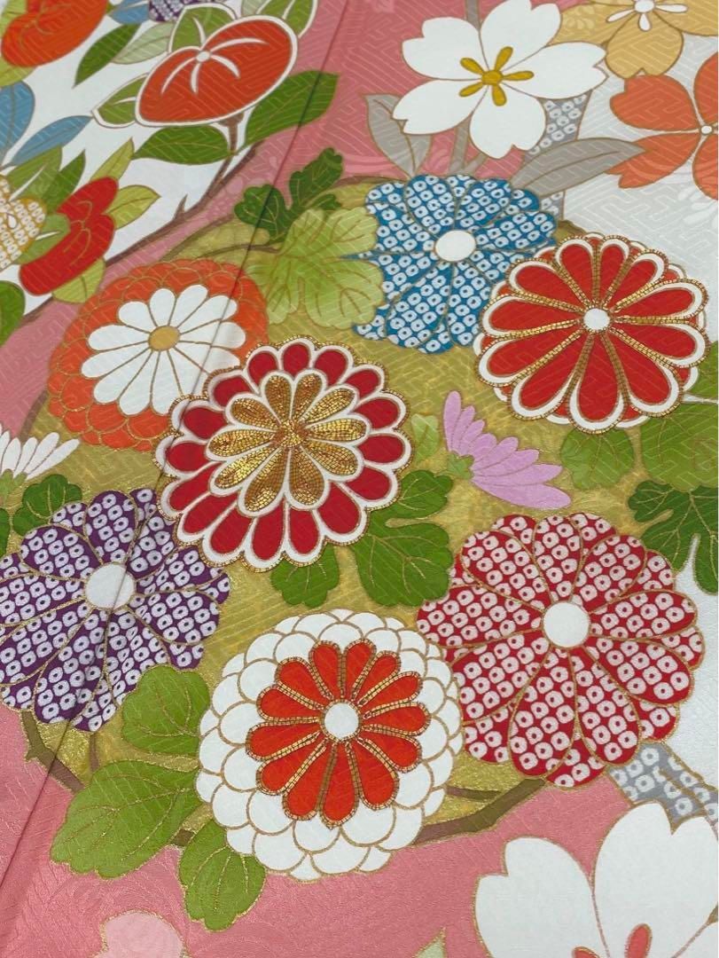 振袖 身丈168cm 裄丈66cm M 袷 雪輪 草花 金糸 金彩 サーモンピンク 正絹