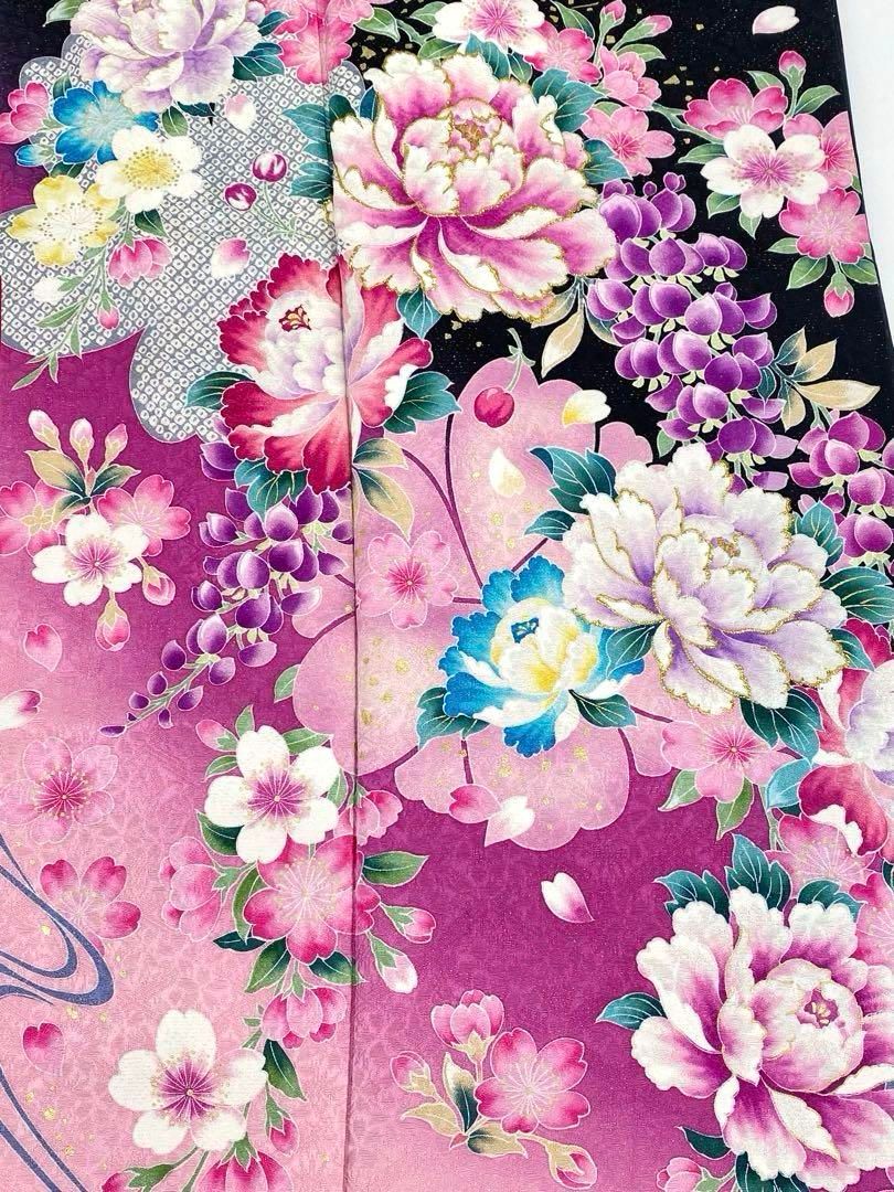 振袖 身丈157cm 裄丈67cm M 袷 御所車 牡丹 金糸 金銀彩 濃紫 正絹 秀品