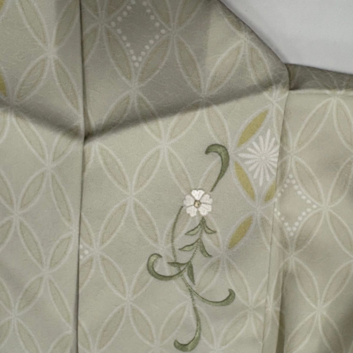 付下げ 身丈169cm 裄丈66.5cm M 袷 洗える着物 草花 七宝 金糸 刺繍 灰緑 化繊 秀品の検索結果