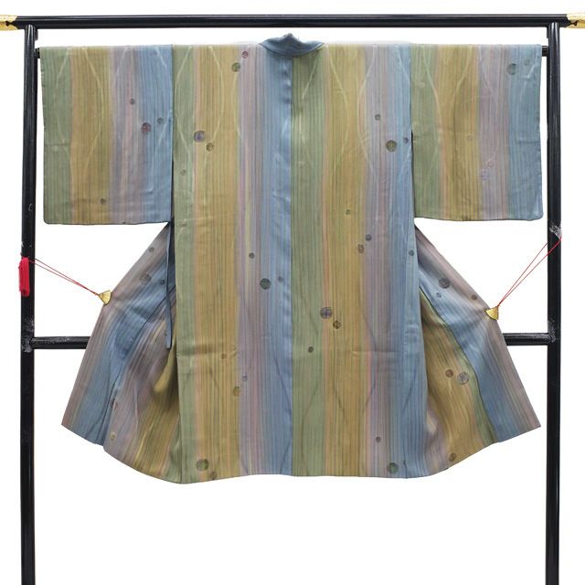 道中着 コート リサイクル 正絹 袷 モール織 地紋 手染め 黄茶色 薄青 灰緑 灰紫 ぼかし 縞 丸文 立涌 カジュアル 春 秋 冬 パールトーン加工済み 仕立て上がり 身丈115 裄丈67.5 Lサイズ ハオリモノ みやがわ sb16448 GLOBALQUALITYIMPORTS_COM