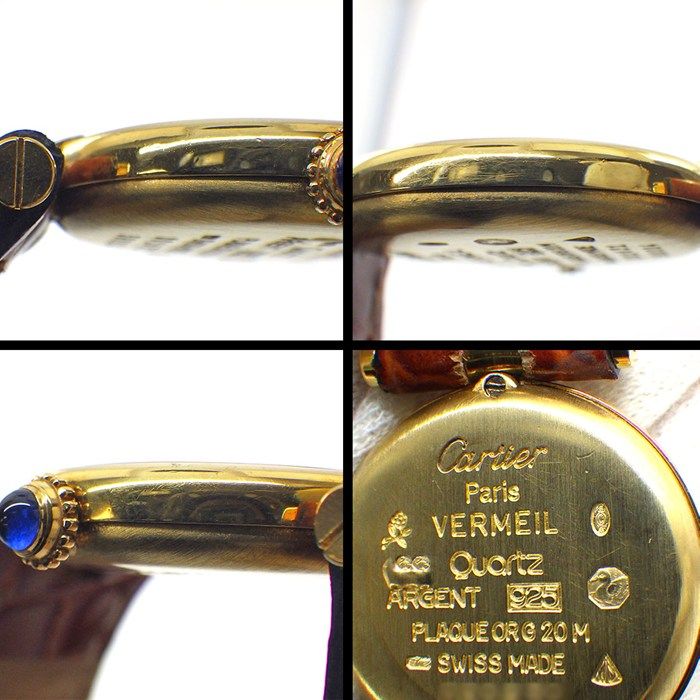 カルティエ Cartier 腕時計 マスト ヴァンドーム SM 590003 ヴェルメイユ ストライプ スリー 文字盤 GP SV925 ブラウン リザード レザーベルト クオーツアナログ