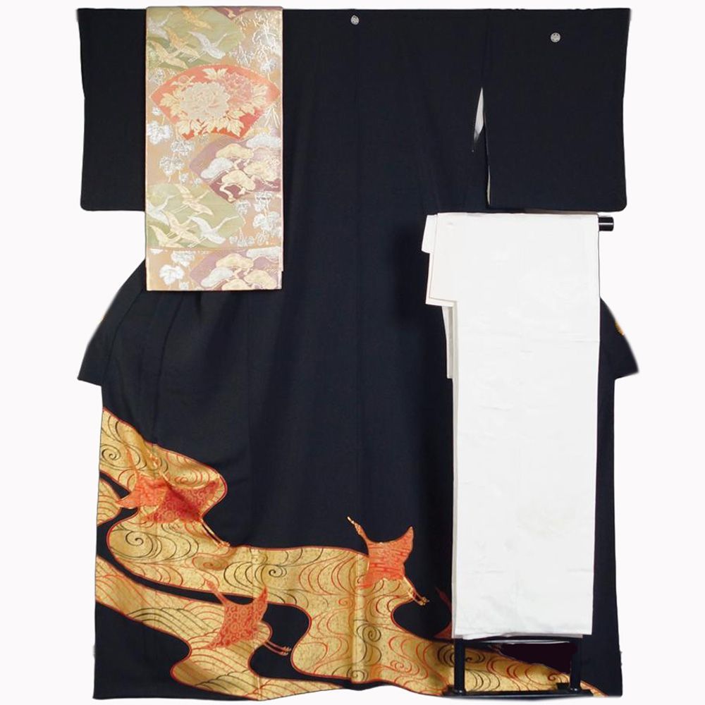 着物セット 黒留袖 袋帯 長襦袢 3点 セット 道長に飛鶴 流水模様 丸に五三の桐紋 五つ紋入り Lサイズ 刺繍 金箔 黒留袖 リサイクル着物 黒留袖 黒とめそで 黒留め袖 留め袖 結婚式 留袖 販売 GLOBALQUALITYIMPORTS_COM