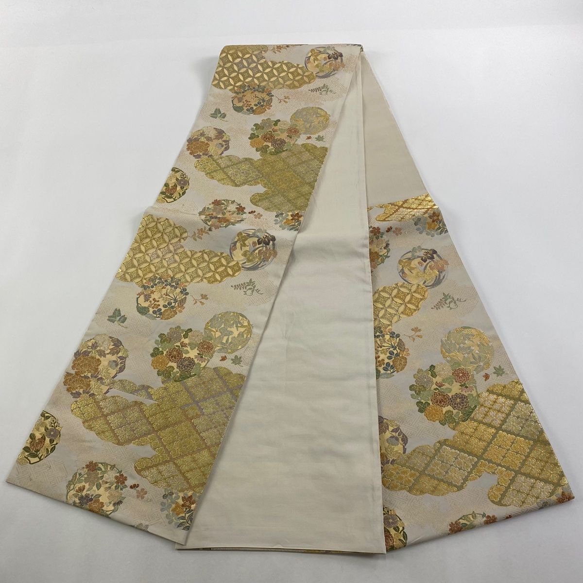 袋帯 秀品 花丸文 雲文 金銀糸 箔 クリーム 六通 正絹 GLOBALQUALITYIMPORTS_COM
