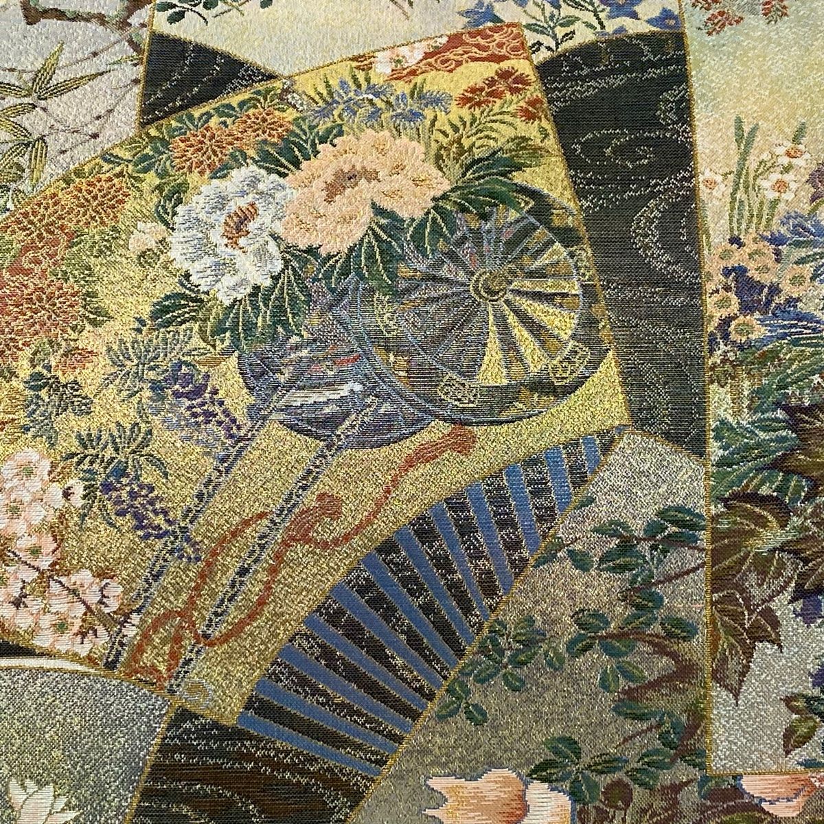 丸帯 日本絵画全集 短冊 草花 箔 薄緑 お太鼓柄 正絹 GLOBALQUALITYIMPORTS_COM
