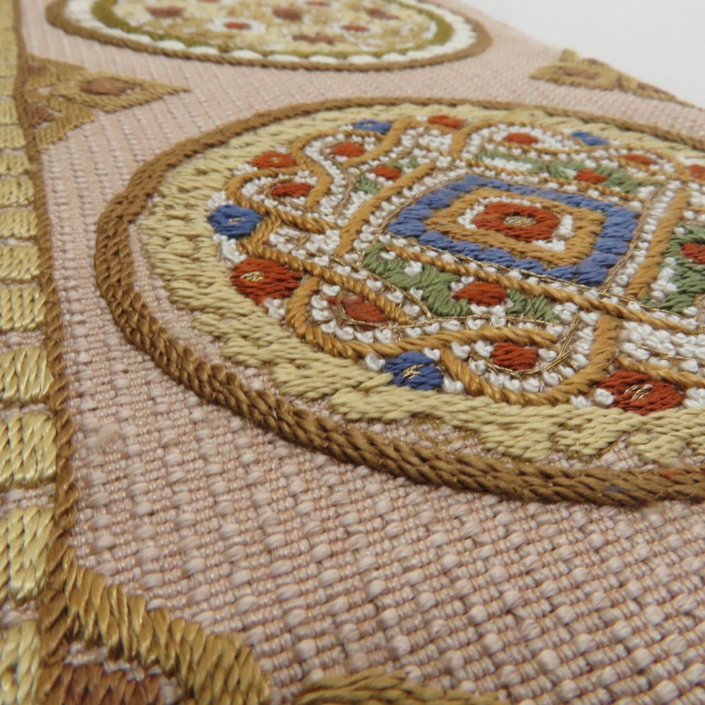 名古屋帯 八寸帯 正絹 薄茶色x多色 オリエンタル模様 お太鼓柄 刺繍入り カジュアル 仕立て上がり 着物帯 長さ382cm