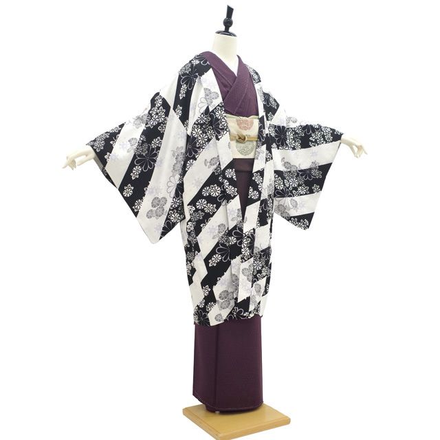 羽織 リサイクル 正絹 袷 金彩加工 白 黒 斜め縞 菊 花 カジュアル 日本和装扱い 春 秋 冬 羽織 パールトーン加工済み 仕立て上がり 身丈110 裄丈71 L~TLサイズ トールサイズ ハオリモノ みやがわ sb16356 GLOBALQUALITYIMPORTS_COM
