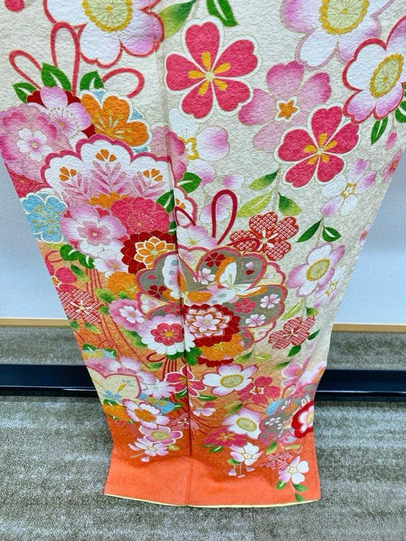 I 着物くつろぎ 振袖 襦袢セット かわいい花模様 金彩 金駒刺繍 桜 菊 扇 小花 赤色 袷 正絹 成人式 着物 身丈166.5 裄68