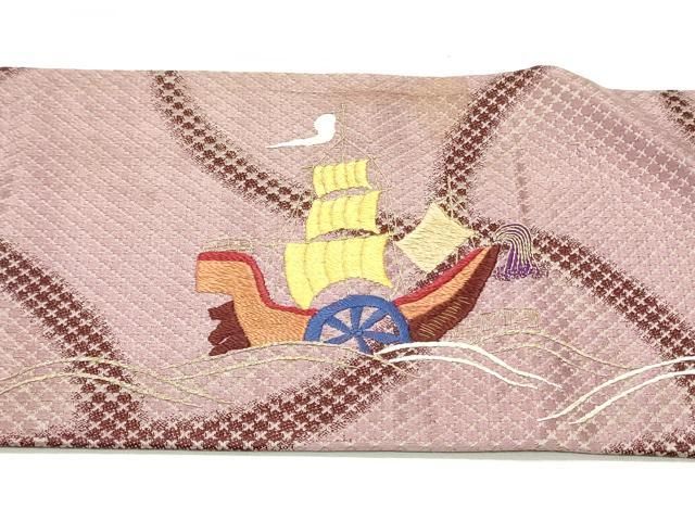 平和屋着物 アンティーク 大正ロマン 九寸名古屋帯 総手刺繍 立波帆船文 銀糸 正絹 DAAY0140obの検索結果