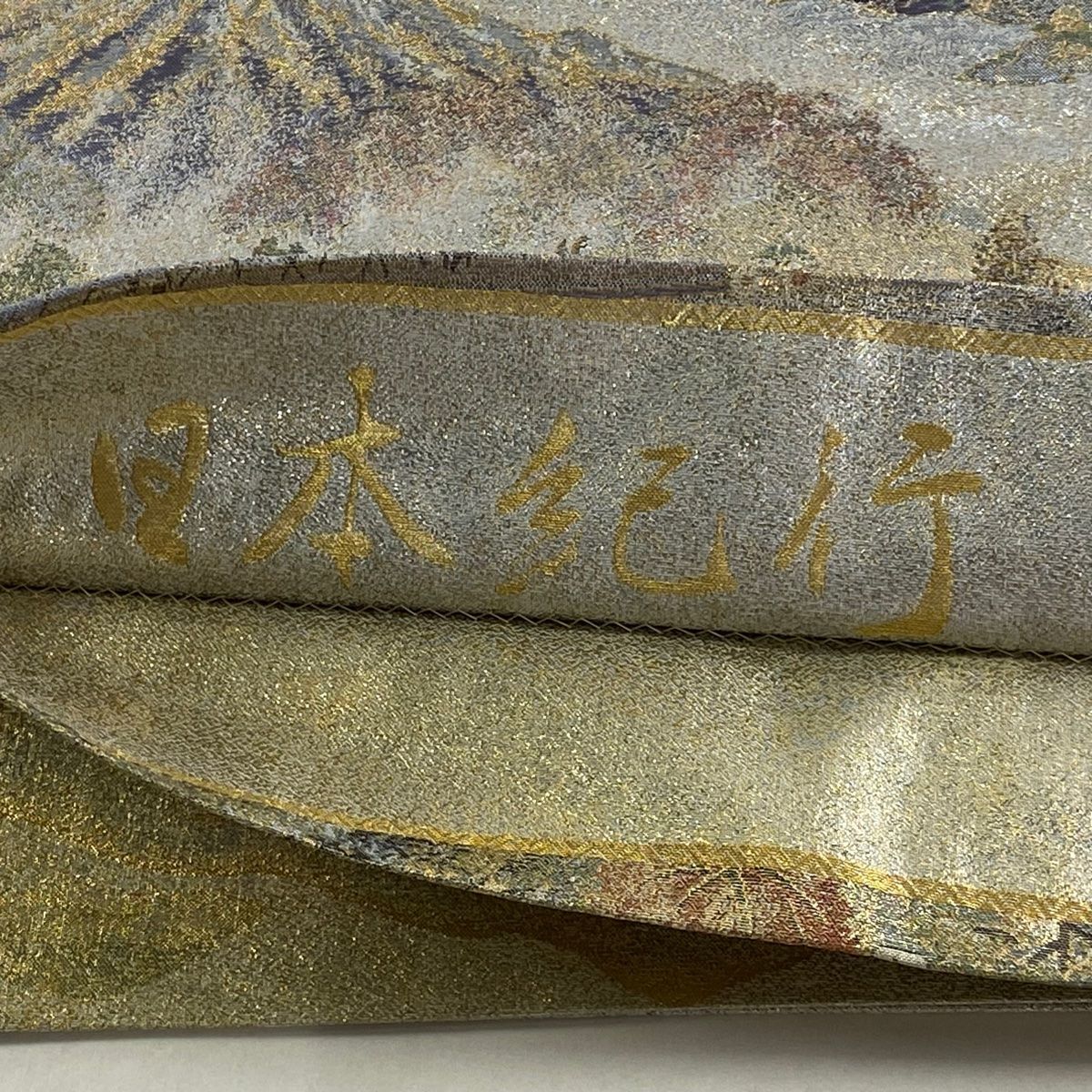 丸帯 日本紀行 建物 樹木 箔 金糸 銀色 お太鼓柄 正絹 GLOBALQUALITYIMPORTS_COM