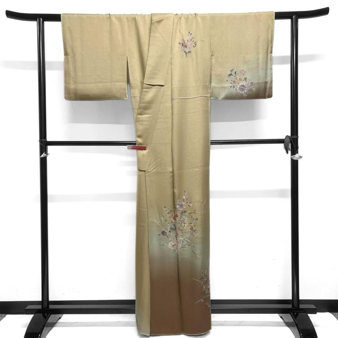 訪問着 身丈164cm 裄丈66cm M 袷 華文 花唐草 銀糸 刺繍 茶緑色 正絹 秀品 一つ紋