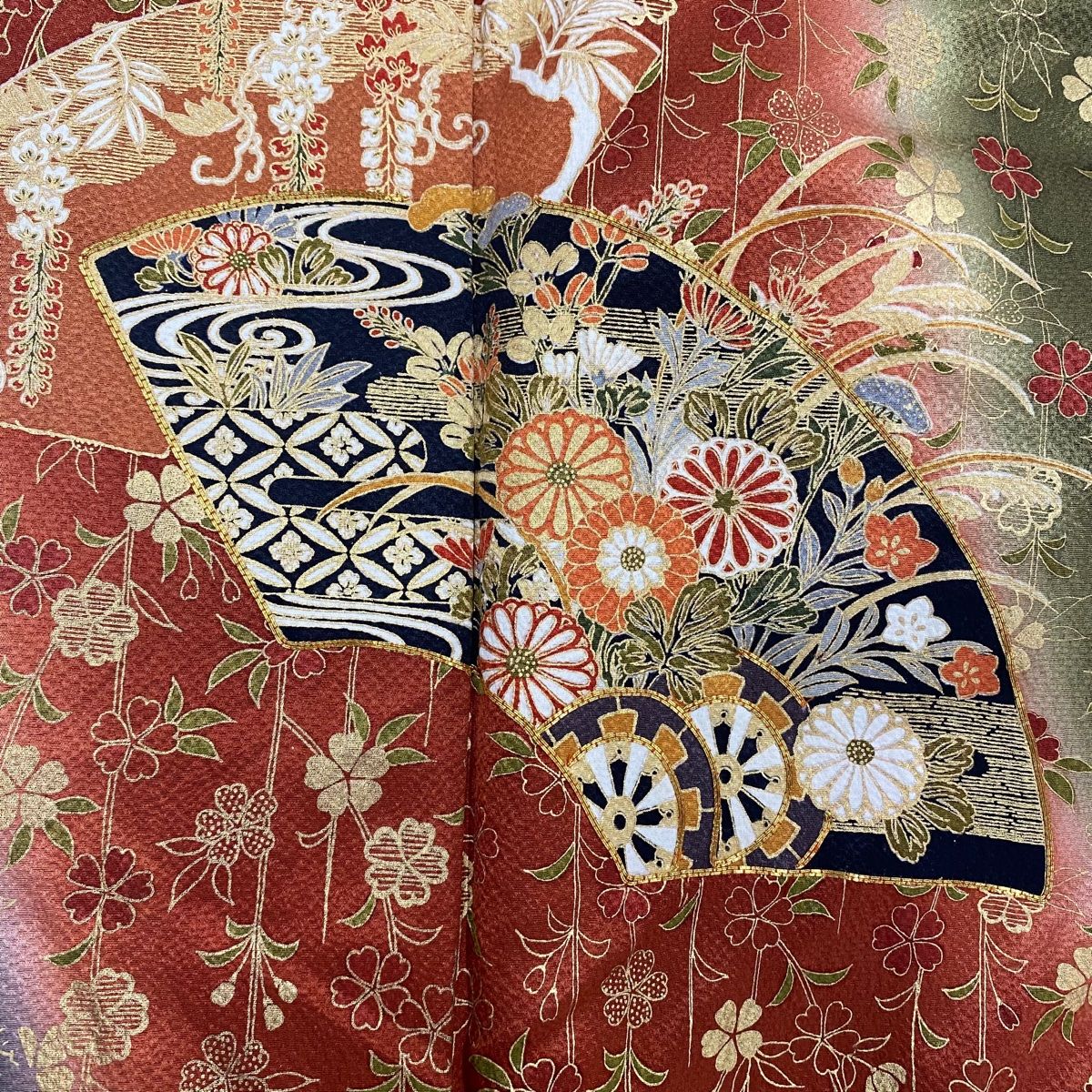 振袖 身丈154.5cm 裄丈66cm M 袷 やまと 枝垂れ桜 花車 金糸 金彩 茜色 正絹 秀品の検索結果