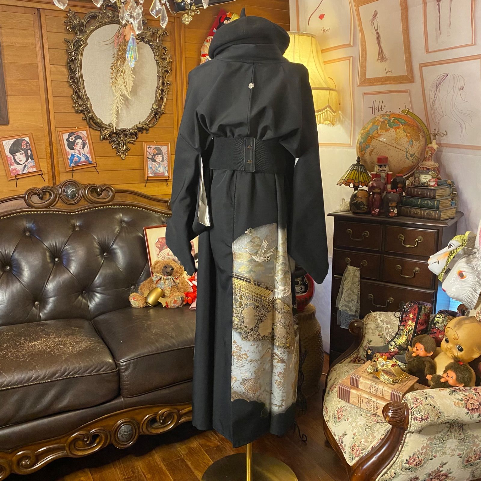 黒留袖 着物 リメイク ワンピース ロングドレス 和洋折衷 洗える 化繊 ハンドメイド レトロ 古着 漆黒に白金の光 静かに舞う鶴 TKW-81 GLOBALQUALITYIMPORTS_COM
