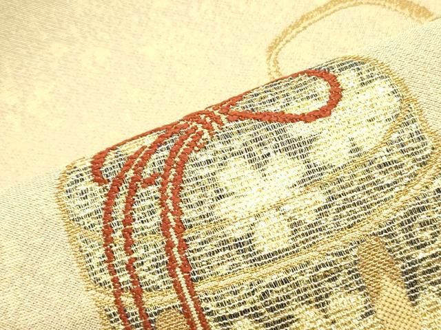 平和屋着物 西陣 東宮織物謹製 九寸名古屋帯 凪織 貝桶花唐草陶器文 金糸 鬼しぼ縮緬 正絹 DAAY0134ob GLOBALQUALITYIMPORTS_COM