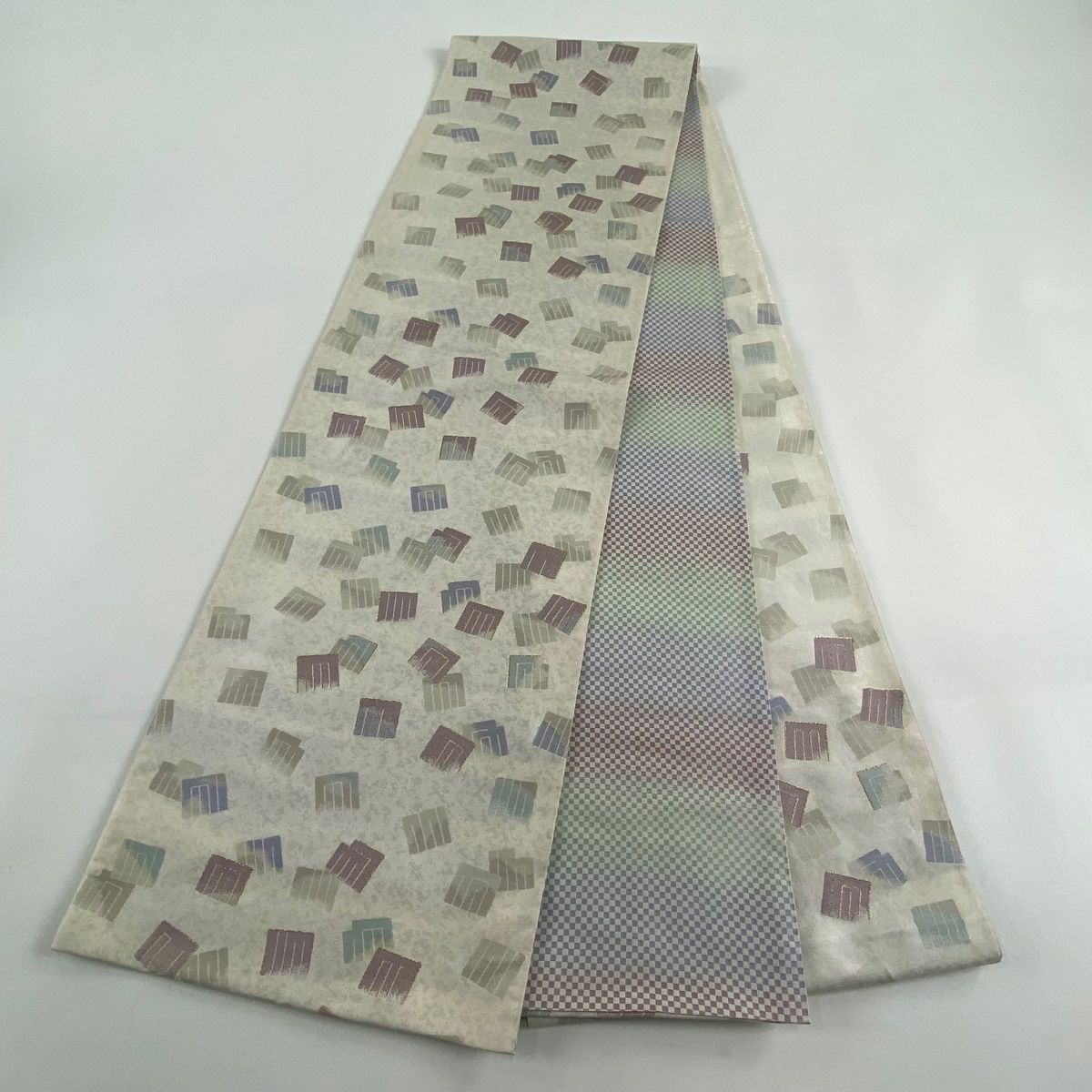 袋帯 彩色花菱裂 段縞 銀糸 箔 灰白 六通 正絹
